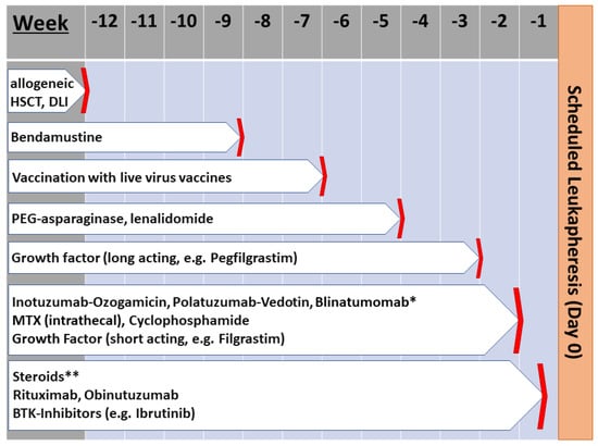 G-CSF (granulocyte colony stimulating factor) induces stem cell mobilization. Stem cells in the leukapheresis product pose the risk of malignant transformation during the process of genetic modification by viral transduction. Therefore G-CSF should be stopped prior to leukapheresis [20,21,22]. Vaccinations with live vaccines should be stopped 6 weeks prior to leukapheresis to prevent virus particles in the CAR-T cell product from being transmitted to the immunosuppressed patient potentially causing a serious viral infection [23]. Furthermore, many standard therapies such as PEG-asparaginase for ALL, the alkylating agent Bendamustin, and the immunomodulator lenalidomide have a profound negative impact on T cell function/proliferation and should not be given within 4 weeks prior to leukapheresis [24].