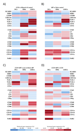 Transcriptional profile comparison of innate receptors in antigen-presenting cells (APCs) from CCl4 animals. (A) CCl4-treated vs. mineral oil control animals, (B) iBP treated animals vs. naïve control group, (C) CCl4+iBP treated vs. non-cirrhotic iBP group, and (D) CCl4+iBP animals vs. CCl4 group. Differential expression of up (red) and downregulated (blue) genes is scaled according to the color depicted. For each gene and each cell population, mean 2−ΔΔCt values were compared between animals in different study groups and represented as the percentage of variation between groups in paired comparisons. SCARB1: scavenger receptor class B member 1; MSR1: macrophage scavenger receptor 1; LSECtin: liver and lymph node sinusoidal endothelial cell C-type lectin; TLR: toll-like receptor; CR: complement receptor; CRIg: complement receptor of the immunoglobulin superfamily; FolR2: folate receptor 2; DC: dendritic cell; HM: hepatic macrophage; iBP: induced bacterial peritonitis; LSEC: liver sinusoidal endothelial cell.