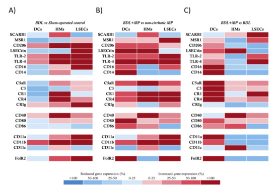 Transcriptional profile comparison of innate receptors in APCs from bile duct ligation (BDL) animals. (A) BDL group vs. sham-operated control animals, (B) BDL+iBP animals vs. non-cirrhotic iBP group, and (C) BDL+iBP group vs. BDL group. Differential expression of up (red) and downregulated (blue) genes is scaled according to the color depicted. For each gene and each cell population, mean 2−ΔΔCt values were compared between animals in different study groups and represented as the percentage of variation between groups in paired comparisons.