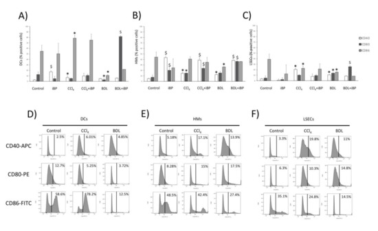 Cell membrane expression of co-stimulatory molecules in hepatic APCs. Cell membrane expression of co-stimulatory molecules CD40, CD80, and CD86 evaluated by flow cytometry in DCs (A), HMs (B), and LSECs (C) from control (n = 6), CCl4 (n = 6), and BDL (n = 6) animals in different experimental conditions. (D–F) Representative histograms, showing the expression of co-stimulatory molecules in DCs (D), HMs (E), and LSECs (F) in control rats and the two experimental models of cirrhosis. * p < 0.01 compared to control rats; $ p < 0.01 compared with the same group without iBP.