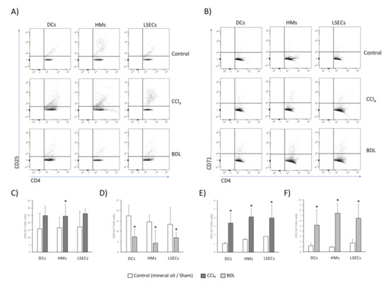 Activation marker expression in spleen-derived T CD4+ cells after co-culture with hepatic APCs. Dot plot images for CD25 (A) and CD71 (B) in CCl4 and BDL models. Mean values ± standard deviation of percentage of T CD4+ cells expressing CD25 in CCl4 (C) and BDL models (D), and CD71 in CCl4 (E) and BDL models (F), are represented from at least 5 animals per group. * p < 0.01 compared with the same cell type in the control group.