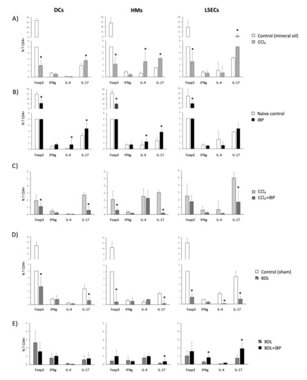 Intracellular expression of Th differentiation markers in spleen-derived T CD4+ cells after co-culture with hepatic APCs. Mean values ± standard deviation of percentage of T CD4+ cells expressing Forkhead box p3 (Foxp3) (Treg), IFNg (Th1), IL-4 (Th2), and IL-17 (Th17) are represented comparing CCl4 vs. mineral oil-treated control (A), iBP vs. control (B), CCl4 vs. CCl4+iBP (C), BDL vs. sham-operated control (D), and BDL vs. BDL+iBP (E) groups. All groups included at least 5 animals. * p < 0.01 compared with each marker in the other represented group.