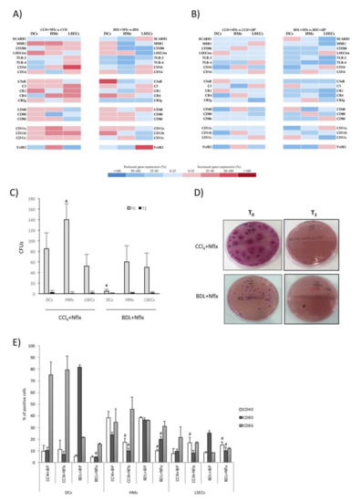 APC analyses in animals treated with norfloxacin. Transcriptional profile representation of innate receptors in (A) antigen-presenting cells from CCl4 and BDL animals with and without norfloxacin, and (B) norfloxacin-treated CCl4 and BDL animals with and without iBP. Differential expression of up (red) and downregulated (blue) genes is scaled according to the color depicted. (C) Internalization of E. coli by hepatic APCs from CCl4 and BDL animals treated with norfloxacin. E. coli-binding and internalizing capacity of APCs was measured by counting CFUs at baseline (T0). To measure APCs’ ability to kill uptaken bacteria, CFUs were counted after 2 h incubation at 37 °C (T2). (D) Representative images of CFUs grown after internalization assay in LSECs. (E) The expression of co-stimulatory molecules—CD40, CD80, and CD86—evaluated by flow cytometry in APCs from CCl4 and BDL animals either with iBP or norfloxacin treatment. All experiments performed in 5 animals per group. * p < 0.01 compared with other cell types at T0 in the same group. # p < 0.01 compared with the corresponding iBP group.