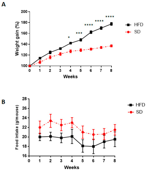 A significant increase in body weight was observed in HFD, starting from week 4, as compared with SD mice (Figure 2A). No significant alterations in food intake were observed in both groups (Figure 2B).