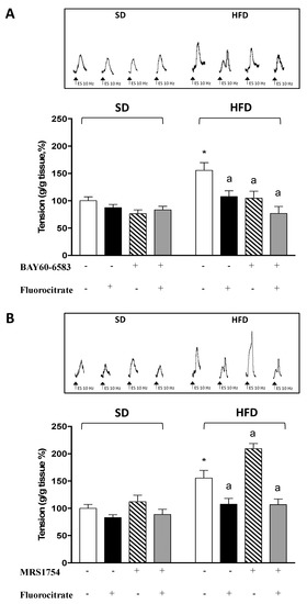 Effects of 1 μM BAY60-6583 (A) or 10 nM MRS1754 (B) on tachykininergic contractions elicited, in the absence or presence of fluorocitrate (50 μM, FC), by electrical stimulation of longitudinal smooth muscle preparations of distal colon from mice fed with standard diet (SD) or high fat diet (HFD). Colonic preparations were maintained in Krebs solution containing 100 μM Nω-nitro-L-arginine methylester (L-NAME), 10 μM guanethidine, 1 μM atropine, 1 μM GR159897 (NK2 receptor antagonist), and 1 μM SB218795 (NK3 receptor antagonist). Each column represents the mean ± SEM (n = 8). * p < 0.05 versus SD; a p < 0.05 versus HFD.