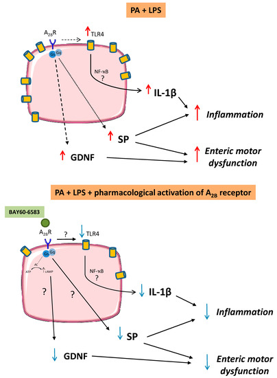 Schematic representation of the proposed role of A2BRs in the modulation of enteric glial cell (EGC) activity under experimental conditions mimicking obesity. In vitro incubation of EGCs with palmitate (PA, 400 μM) and lipopolysaccharide (LPS, 10 μg/mL) elicited an increase in TLR4 expression as well as substance P (SP), glial cell-derived neurotrophic factor (GDNF), and interleukin (IL)-1β release, suggesting an involvement of these cells in supporting the enteric inflammation and abnormal tachykininergic enteric motor responses associated with obesity. The pharmacological stimulation of A2BRs on EGCs, besides reducing TLR4 expression and IL-1β levels, can also counteract the abnormal increase in GDNF and SP release. A2BR: adenosine A2B receptor; AC: adenylyl cyclase; ATP: adenosine triphosphate; cAMP: cyclic adenosine monophosphate; NF-ҡB: nuclear factor kappa-light-chain-enhancer of activated B cells.
