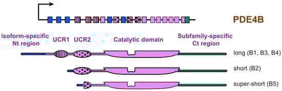 - Cheung, Y.-F.; Kan, Z.; Garrett-Engele, P.; Gall, I.; Murdoch, H.; Baillie, G.; Camargo, L.M.; Johnson, J.M.; Houslay, M.; Castle, J.C. PDE4B5, a Novel, Super-Short, Brain-Specific cAMP Phosphodiesterase-4 Variant Whose Isoform-Specifying N-Terminal Region Is Identical to That of cAMP Phosphodiesterase-4D6 (PDE4D6). J. Pharmacol. Exp. Ther. 2007, 322, 600. [Google Scholar] [CrossRef] [PubMed]