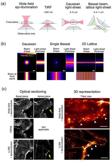LLSM, which enables ultrafast 3D scanning with high spatial resolution [11], is an advanced type of light-sheet microscopy [19]. In contrast to a conventional light-sheet, created by several micron-thick Gaussian beams, the lattice light-sheet is generated by a massive parallel array of non-diffracting light beams (Bessel beams) that mutually interfere to create an ultrathin light-sheet of 0.4–1 μm thick extending over cellular dimensions [11] (Figure 2a,b). Scanning with the ultrathin light-sheet reduces fluorescence photobleaching and phototoxicity, obtaining images of whole cells for hundreds of volumes at subsecond intervals at the resolution of ~230 nm laterally and ~370 nm axially [11].