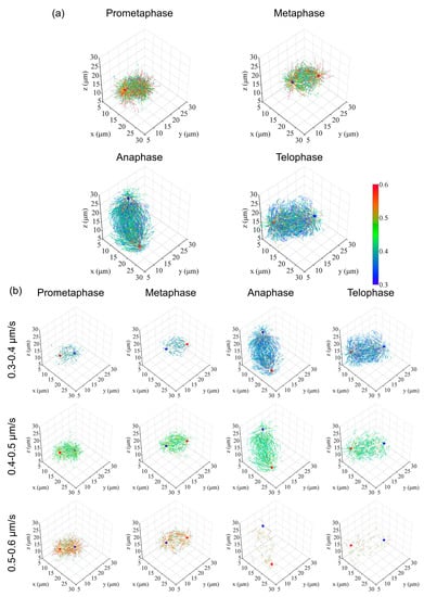Examples of digital spindle analysis. (a) Digitized and 3D-represented microtubule growth trajectories in various mitotic phases, represented using custom tools created in Matlab. For original images and EB1–GFP tracking to generate trajectories, see also Video S2. Three cell data (prometa, meta, ana) and two cell data (telo) were merged to generate average models. To improve visibility, trajectories were randomly extracted at approximately 13% per cell (prometa, meta, ana) or 20% per cell (telo). Red and blue dots indicate centrosome position. Orange and cyan dots indicate the start and end position of trajectories, respectively. The colored bar indicates the range of the mean travel speed of EB1–GFP comet trajectories (0.3–0.6 µm/s). (b) Merged trajectories were divided into 10 classes spanning the entire speed data range (0–1 µm/s, 0.1 µm/s steps). Data included in the 0.3–0.6 µm/s range are shown. Markers are similar to those in (a). Data are reused from [12].