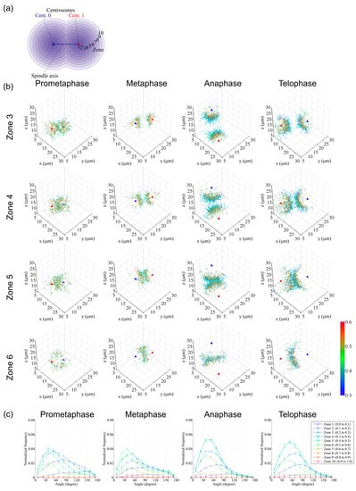 Examples of digital spindle analysis (continued). (a) To classify trajectories according to the start position, a spherical classification bin (zone) was set. Spheres centered at centrosomes (red and blue triangles) and with radii equal to the intercentrosomal distance were generated, and then divided into 10 spherical zones of equal radial length. (b) Trajectories starting at each zone were extracted and plotted in 3D coordinate systems. The trajectories are shown with colors corresponding to the average speed of each trajectory, with orange dots at the start of the trajectory and cyan dots at the end. The colored bar indicates the mean speed (µm/s). (c) The travel angle of each comet against the spindle axis was analyzed and plotted for each zone. Data are reused from [12]. Plots in (b,c) were generated using custom tools created in Matlab.