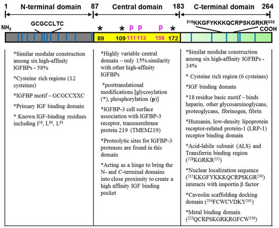 Human IGFBP-3 is comprised of 264 amino acids, of which the molecular mass is 28.7 kDa without any post-translational modifications [1]. The primary structures of human IGFBP-3 consist of three distinct domains: a highly conserved cysteine-rich N- and C-terminal domains and a nonconserved central domain. Each domain contains various functional motifs/sequences that confer IGFBP-3’s diverse IGF/IGF-IR-dependent and IGF/IGF-IR-independent actions (Figure 1) [2,3,4,5,6]. These distinctive functional motifs/sequences include a caveolin scaffolding docking domain, a metal binding domain, heparin binding motifs, a retinoic acid binding motif, and a nuclear localization sequence.