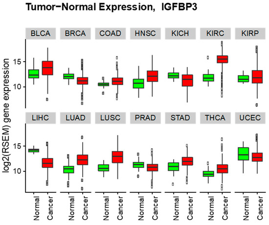 Increased IGFBP-3 expression was observed in kidney renal clear cell carcinoma (log2 fold change +3.44), lung squamous cell carcinoma (log2 fold change +2.26), lung adenocarcinoma (log2 fold change +1.94), head and neck squamous cell carcinoma (log2 fold change +1.32), stomach adenocarcinoma (log2 fold change +1.18), thyroid carcinoma (log2 fold change +1.11), bladder urothelial carcinoma (log2 fold change +1.05), colon adenocarcinoma (log2 fold change +0.65), and kidney renal papillary cell carcinoma (log2 fold change +0.34). On the other hand, decreased expression of IGFBP-3 was observed in liver hepatocellular carcinoma (log2 fold change −2.53), kidney chromophobe (log2 fold change −1.07), breast invasive carcinoma (log2 fold change −0.82), prostate adenocarcinoma (log2 fold change −0.56), and uterine corpus endometrial carcinoma (log2 fold change −0.43).