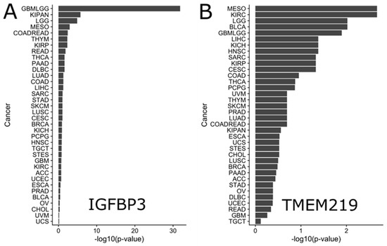 Survival effect of IGFBP-3 (A) and TMEM219 (B) in various cancers. Larger size of each bar corresponds to the more significant effect on survival.