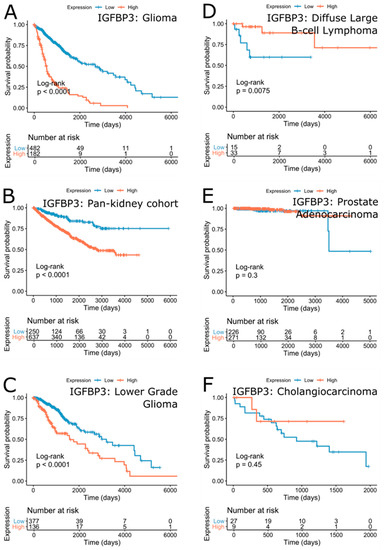 Analysis of the survival effect of IGFBP-3 expression in all cancers identified its highly significant effect on survival in glioma (FDR = 1.51∙10−32 (Hazard Ratio, HR = 4.39)) (Figure 5A and Figure 6A). Survival in pan-kidney cohort (KICH+KIRC+KIRP), lower grade glioma, mesothelioma, colorectal adenocarcinoma was similarly affected by IGFBP-3 to a lesser extent (FDR = 1.74∙10−6 (HR = 2.73), 1.25∙10−5 (HR = 2.36), 1.22∙10−3 (HR = 2.98), 3.87∙10−3 (HR = 2.20), respectively) (Figure 6B,C). On the other hand, higher IGFBP-3 was suggestive of better survival outcome in lymphoid neoplasm diffuse large B-cell lymphoma (FDR = 2.58∙10−2 (HR = 0.14)), breast cancer (1.20∙10−1 (HR = 0.74)), prostate adenocarcinoma (3.43∙10−1 (HR = 0.51)), cholangiocarcinoma (4.84∙10−1 (HR = 0.57)), bladder urothelial carcinoma (3.63∙10−1 (HR = 0.84)), and uterine carcinosarcoma (6.65∙10−1 (HR = 0.860)) (Figure 6D–F).