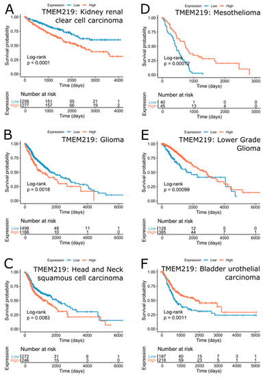 The TMEM219 survival effect was less significant than that of IGFBP-3 (Figure 5B). Nevertheless, the lower expression of the TMEM219 gene was associated with survival in kidney renal clear cell carcinoma (FDR = 2.14∙10−3 (HR = 1.85)), glioma (FDR = 1.27∙10−2 (HR = 1.56)), lymphoid neoplasm diffuse large B-cell lymphoma (FDR = 4.110.54)), head and neck squamous cell carcinoma (FDR = 4.17E-2 (HR = 1.43)) and pan-kidney cohort (KICH+KIRC+KIRP) (FDR = 2.76E-1 (HR = 1.2)) (Figure 7A–C). On the contrary, the higher expression of TMEM219 was better for survival in mesothelioma (FDR = 2.14E-3 (HR = 0.39)), lower grade glioma (FDR = 9.54E-3 (HR =0.54)), prostate adenocarcinoma (FDR = 2.02∙10−1 (HR = 0.18)), thyroid carcinoma (FDR = 1.332∙10−1 (HR = 0.39)) and bladder urothelial carcinoma (FDR = 9.54∙10−3 (HR = 0.61)) (Figure 7D–F).