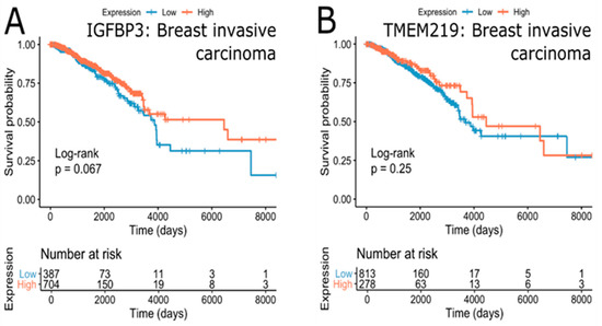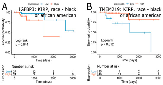 Survival effect of IGFBP3 (A) and TMEM219 (B) in “race-black or African-American.” Kidney renal papillary cell carcinoma. Unadjusted p-values are shown.
