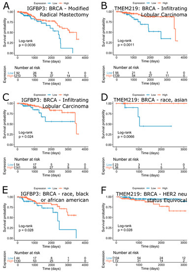 Since the expression of IGFBP-3 and TMEM219 was not significantly associated with survival outcome in breast cancer, it is possible that heterogeneity of the disease may prevent the detection of significant associations. Consequent analysis of the survival effect of IGFBP-3 and TMEM219 in clinical subgroups of the breast cancer cohort revealed that clinical subgroup annotated as “histological type-Infiltrating Lobular Carcinoma” show marginally significant association of IGFBP-3 (FDR = 2.01∙10−1 (HR = 0.36)) and TMEM219 ((3.96∙10−2 (HR = 0.25)) with the survival outcome (Figure 10B,C). For both genes, high expression was associated with a better prognosis. These results suggest that targeting the IGFBP-3/TMEM219 system in patients diagnosed with infiltrating lobular carcinoma, which is the second most common type of breast cancer, may be beneficial. Other clinical subgroups of breast cancer patients included “breast_carcinoma_surgical_procedure_name-Modified Radical Mastectomy” (IGFBP-3, FDR = 1.26∙10−1 (HR = 0.44), Figure 10A), “lab_proc_her2_neu_immunohistochemistry_receptor_status-Equivocal” (TMEM219, FDR = 3.27∙10−1 (HR = 3.29)). Of note were race-specific survival effects with high expression of IGFBP-3 being beneficial in the “race-black or African-American” subgroup (FDR = 2.01∙10−1 (HR = 0.42), Figure 10E) and TMEM219 high expression being beneficial in the “race-Asian” subgroup (FDR = 1.16∙10−1 (HR = 0.00), Figure 10D). Confirming our previous observations, the survival benefits of IGFBP-3 expression in breast cancer were consistently associated with high IGFBP-3 expression, while the effect of TMEM219 was more diverse and subgroup-specific.