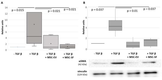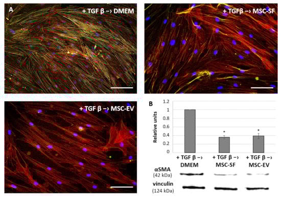 We induced the differentiation of fibroblasts into myofibroblasts by incubation in the presence of TGFbeta for 4 days in serum-free conditions. At the end of the incubation, the medium was replaced by serum-free DMEM or MSC-CM fractions (MSC-SF or MSC-EV). Using immunoblotting and immunofluorescence assay, we found that the addition of MSC-CM fractions to myofibroblasts caused a decrease in aSMA content in the cells by more than two-fold compared with differentiated myofibroblasts (p < 0.05) (Figure 6).