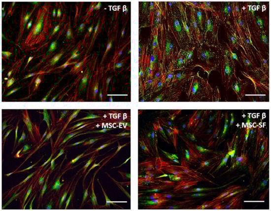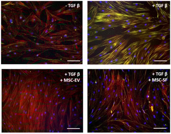MSC-CM fractions added simultaneously with TGFbeta prevented the TGFbeta-induced aSMA redistribution into stress fibers in fibroblasts. Immunofluorescent analysis (aSMA (green), phalloidin (red), DAPI (blue)) of the content of aSMA in serum-free cultured control fibroblasts (− TGFbeta), in fibroblasts after exposure to TGFbeta (+ TGFbeta) and TGFbeta with the components of MSC-CM (+ TGFbeta + MSC-EV; + TGFbeta + MSC-SF). Scale bar: 100 μm.