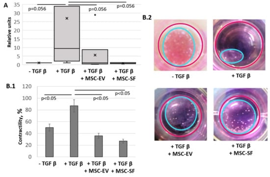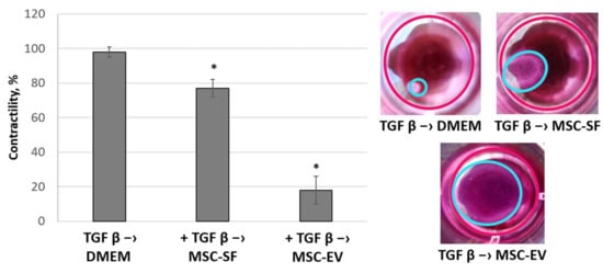 The addition of MSC-CM fractions also caused a decrease in the ability of myofibroblasts to reduce the collagen gel size. The most pronounced effect was exerted by the MSC-EV fraction. Myofibroblasts almost completely lost their contractile activity after MSC-EV were added (Figure 7).