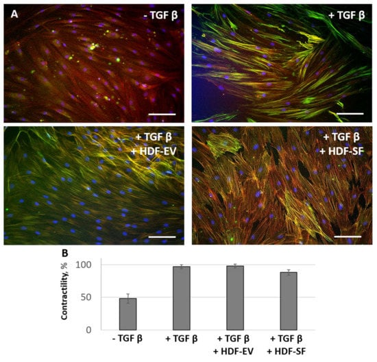 Human dermal fibroblasts conditioned medium (HDF-CM) fractions added simultaneously with TGFbeta were not able to prevent the TGFbeta-induced aSMA redistribution into stress fibers and contractile activity of fibroblasts. The expression of aSMA in serum-free cultured control fibroblasts (− TGFbeta), in fibroblasts after exposure to TGFbeta (+ TGFbeta), and TGFbeta with the components of HDF-CM (+ TGFbeta + HDF-EV; + TGFbeta + HDF-SF). (A) Immunofluorescent analysis (aSMA (green), phalloidin (red), DAPI (blue)). Scale bar: 100 μm. (B) Collagen contraction assay.