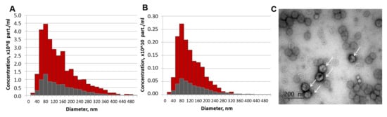 Characterization of extracellular vesicles (EVs) released from mesenchymal stromal cell (MSC) after 48 h of conditioning. (A,B) Particle size distributions of EV preparations (red) and control aliquots of MSC-CM after 30 min of conditioning (grey) for non-concentrated (A) and 5-fold concentrated (B) samples measured by nanoparticle tracking analysis (NTA). (C) MSC-EV imaging by the transmission electron microscopy (EVs are indicated by arrows).