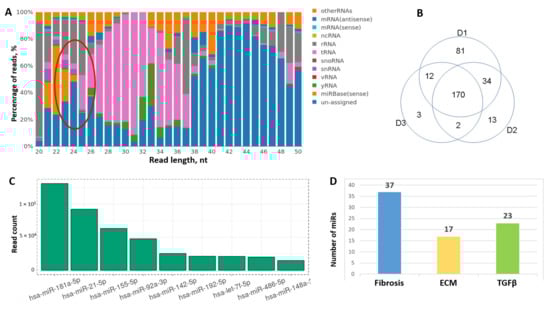 Analysis of RNA profile in MSC-EV by RNA-seq. (A) Different types of RNAs are represented in MSC-EV. Cluster of microRNAs marked by red oval. (B) Variability of microRNA representation in donor adipose tissue-derived MSC-EV by Venn diagrams. (C) The most abundant microRNAs in MSC-EV (top-10). (D) Fibrosis-associated microRNA representation in MSC-EV based on their predicted gene target analysis.
