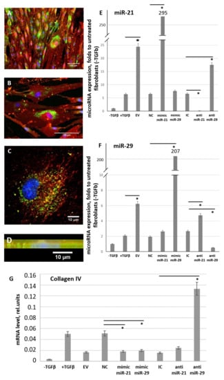 MSC-EV transfer microRNAs from MSC to fibroblasts within MSC-EV. (A–D) Uptake of MSC-EV transfected with FAM-labeled (green) oligos by fibroblasts after 48 h of incubation. (A,B) wide-field microscopy, (C) confocal microscopy, (D) confocal microscopy, sagittal section. Immunofluorescent analysis (FAM (green), PKH26 (red), DAPI (blue)). (E,F) Expression of miR-21 (E) and miR-29c (F) in cultured control fibroblasts (− TGFbeta) and in fibroblast after exposure to TGFbeta (+ TGFbeta) incubated for 96 h in the presence of MSC-EV transfected with specific microRNA mimics or antagomirs. Real-time PCR was used for the analysis. The results were normalized to the untreated control fibroblasts (− TGFbeta). (G) Expression of miR-21 and miR-29c target gene (collagen IV) in cultured control fibroblasts (− TGFbeta) and in fibroblast after exposure to TGFbeta (+ TGFbeta) incubated for 96 h in the presence of MSC-EV transfected with specific microRNA mimics or anti-miRs. Real-time PCR was used for the analysis. EV: MSC-EV without transfection, NC: MSC-EV transfected by negative control oligos (control for miR mimics), IC: MSC-EV transfected by inhibitory control oligos (control for anti-miRs), mimic miR-21: MSC-EV transfected by mimic miR-21, mimic miR-29: MSC-EV transfected by mimic miR-29, anti-miR-21: MSC-EV transfected by anti-miR-21, anti-miR-29: MSC-EV transfected by anti-miR-29 * p < 0.05 (compared to the correspondent control group).