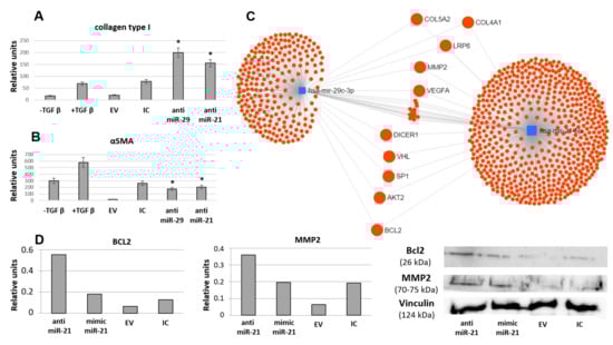 Inhibition of selected microRNAs (miR-21 and miR-29c) by antagomiRs attenuates EV-mediated MSC ability to prevent TGFbeta-induced differentiation of fibroblasts into myofibroblasts evaluated by collagen type I production (A) and aSMA expression (B), Western blotting (n = 3). EV: MSC-EV without transfection, IC: MSC-EV transfected by inhibitory control oligos (control for anti-miRs). anti-miR-21: MSC-EV transfected by anti-miR-21, anti-miR-29: MSC-EV transfected by anti-miR-29 * p < 0.05 (compared to control groups). (C) Common targets of miR-21 and miR-29c predicted using MirNet service. (D) Impact of miR-21 transferred by MSC-EV into the regulation of selected pro-fibrotic targets in fibroblasts evaluated by Western blotting (n = 1).