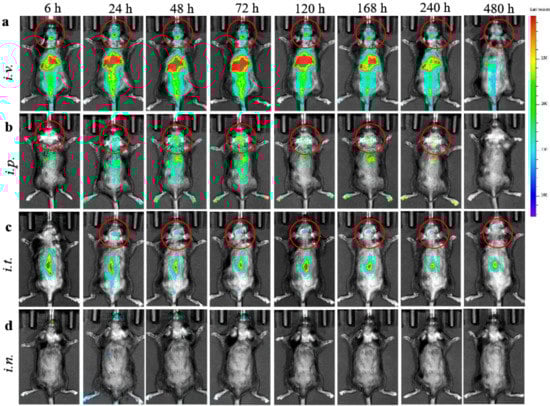 Biodistribution of 1,1’-Dioctadecyl-3,3,3’,3’-tetramethylindo-carbocyanine iodide (DIR)- extracellular vesicles (EVs) in CLN2 KO mice by IVIS. DIR-labeled EVs were administered in BD mice (1 month old, N = 4), though: (a) i.v. (6 × 1011 particles/200 µL), (b) i.p. (6 × 1011 particles/200 µL), (c) i.t. (1.5 × 1011 particles/50 µL), or (d) i.n. (6 × 1010 particles/20 µL) routes, and imaged up to 480 h. Prone representative images show prolonged DIR signal accumulation in the brain for i.v., i.p., and i.t. administration routs, especially at 24–120 h. Little, if any, DIR signal was observed in live animals after i.n. administration (d). Accumulation of labeled EVs was also observed in the main peripheral organs for i.v. and i.p. injections.