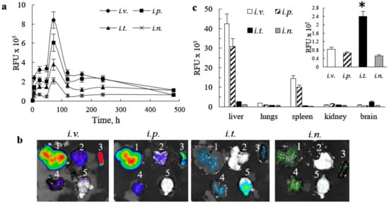 The quantification of fluorescence levels of DIR-EVs signal in the brain area of BD mice was assessed on IVIS images using Aura software (Figure 2a). For all routes of administration, the maximal DIR-EVs signal in the brain was detected at 72 h after administration and decreased in the row: i.v. > i.p. > i.t. > i.n. injections (Figure 2a). One should keep in mind that the i.t. injected dose was four times, and i.n. injection was ten times lesser than those injected via i.p. and i.v. administration routes. Additionally, imaging in living animals does not allow one to discriminate whether or not fluorescence levels of DIR-EVs represent the amount of nanocarriers in the blood or the brain tissues. Therefore, this observation may result from both an accumulation of DIR-EVs in the brain tissues, as well as in the blood circulation.