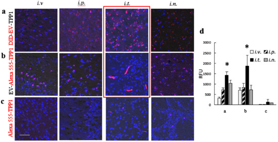 To identify the administration route that provides the most efficient brain delivery of TPP1 incorporated into EVs nanocarriers, fluorescently-labeled EV-TPP1 formulations were prepared by sonication procedure using DID-EVs (1011 particles/mL), and Alexa 555-TPP1 (0.2 mg/mL), and administered into Cln2 KO mice (N = 6), via the four various routes described above. Specifically, mice were injected with fluorescently-labeled DID-EVs with incorporated non-labeled TPP1; or fluorescently labeled Alexa 555-TPP1 incorporated into non-labeled EVs, or Alexa 555-TPP1 alone (without EVs nanocarriers). Of note, similar to IVIS experiments, the maximal volume of EV-TPP1 suspension allowed for each route of administration was used (specifically, 200 µL for i.v. and i.p. injections, 50 µL for i.t. injection, and 20 µL for i.n. injections). At the optimal time point determined in IVIS studies (72 h), mice were sacrificed, perfused; brains were harvested, sliced, mounted on slides with nuclei staining DAPI, and examined by confocal microscopy (Figure 3). The representative images of brain slides of BD mice injected with DID-EV-TPP1, or EV-Alexa 555-TPP1 showed significant accumulation of both the EVs nanocarriers (Figure 3a) and incorporated TPP1 (Figure 3b) in the brain, after all examined administration routes. Importantly, the similar patterns of EVs and TPP1 distribution in case of EVs labeled through the incorporation of hydrophobic DID dye into EVs membranes (Figure 3a), or TPP1 labeled through covalent conjugation with Alexa 555 (Figure 3b) confirmed that recorded fluorescence reflects the distribution of the nanocarriers and TPP1, but not the leaked residual fluorescent dyes alone. Little, if any, fluorescent signal of Alexa 555-TPP1 was recorded in the case of TPP1 injection without nanocarriers (Figure 3c). In accordance with IVIS data, a single i.t. injection of EV-TPP1 provided the topmost levels of EVs nanocarriers (Figure 3a), as well as TPP1 incorporated into EVs (Figure 3b), in the brain of BD mice. The distribution of TPP1 delivered in EVs to the different brain regions through i.t. injection is presented on Supplementary Figure S5. A significant amount of TPP1 was delivered by EVs nanocarriers to all examined brain regions, especially hypothalamus, thalamus, and pons. The quantification of fluorescent levels on confocal images confirmed that the i.t. route is the optimal one for the CNS delivery of TPP1 (Figure 3d).