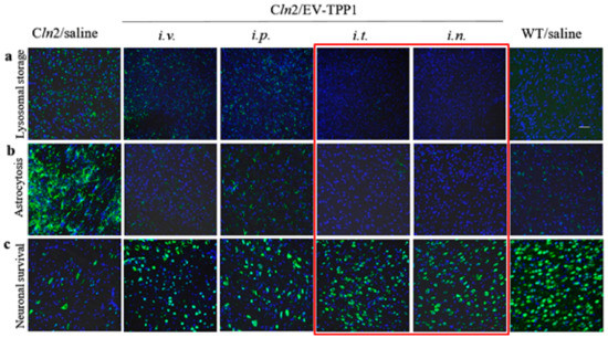 Consequently, we compared the therapeutic efficacy of EV-TPP1 treatments using four administration routes (i.v, i.p., i.t., and i.n.) The main parameters, including accumulation of storage material in the brain tissues, neuroinflammation and neuronal survival were examined in BD mice. All treatment routes provided significant therapeutic effects resulting in decreased astrocytosis and increased neuronal survival, especially in the case of i.t. and i.n. injections. In addition, the superior reduction of lysosomal storage material in the brain was observed after i.t. injections of EV-TPP1.
