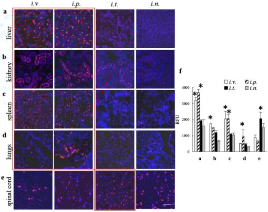 Along with the brain tissues, the delivery of TPP1 to main peripheral organs is of great importance for successful ERT. We examined the accumulation of Alexa 555-TPP1 incorporated into EVs in liver, kidney, spleen, and lungs, as well as in the spinal cord in CLN2 KO mice that were treated via various administration routes described above (Figure 5). Mice were injected with the same doses of EV-Alexa 555-TPP1, and slides of the main organs were processed as described in Figure 3. Representative confocal images of main organs (Figure 5a–e), as well as the quantification of Alexa 555-TPP1 signals (Figure 5f), indicated that i.v. and i.p. administrations provided the largest amount of TPP1 in peripheral organs, liver, kidney, spleen and lung (Figure 5a–d,f). In addition, the administration of EV- TPP1 through the i.t. route resulted in high levels of the enzyme in the spinal cord of BD mice (Figure 5e,f).