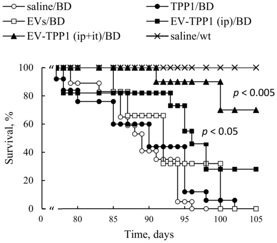 CLN2 KO mice (one-week-old, N = 6) were injected through i.p. route with EV-TPP1 formulation loaded by sonication (4.5 × 1010 particles/150 µL/mouse; 15 mg/kg TPP1) twice a week, over six weeks. Another group was treated with a combination of i.p. injections (same schedule as described above), and i.t. injections of EV-TPP1 (1.5 × 1010 particles/50 µL/mouse; 5 mg/kg TPP1), for five weeks. BD mice were treated twice a week, over six weeks, with: saline (150 µL/mouse), or empty (sham) EVs (4.5 × 1010 particles/150 µL/mouse), or TPP1 alone (15 mg/kg TPP1) were used as controls. Finally, WT littermates treated with saline were used in another control group. The survival in each animal group was recorded for over three months.