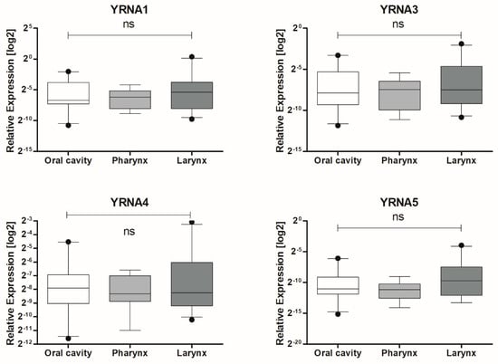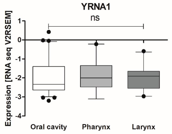 The expression levels of YRNA1 in three locations of HNSCC. Oral cavity (n = 76), pharynx (n = 19), and larynx (n = 21); one-way ANOVA with Dunn’s multiple comparisons post-test; ns—not significant.