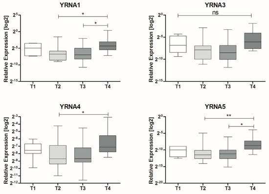 Expression levels of YRNA1, YRNA3, YRNA4, and YRNA5 in patients’ FFPET samples. Divided according to HNSCC T stage; one-way ANOVA with Kruskal–Wallis post-test or Dunn’s multiple comparison test; * p < 0.05; ** p < 0.01; ns—not significant.