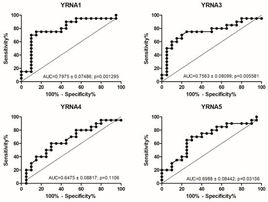 Receiver operating characteristic (ROC) analysis of YRNA1, YRNA3, YRNA4 and YRNA5. Examined in 20 paired patients’ samples; p < 0.05 considered to be significant. AUC, area under the curve.