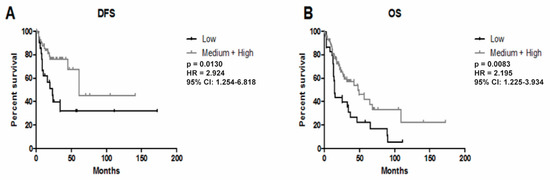 Disease-free survival (DFS) and overall survival (OS) analyses were performed using two subgroups (low and medium + high), generated using 25% gene expression as the cut-off. Next, the subgroups were compared using log-rank (Mantel–Cox), Gehan–Breslow–Wilcoxon, and hazard ratio (Mantel–Haenszel; HR) tests. The 95% confidence interval (CI) of the ratio was calculated. In all analyses, p < 0.05 was used to determine statistical significance.