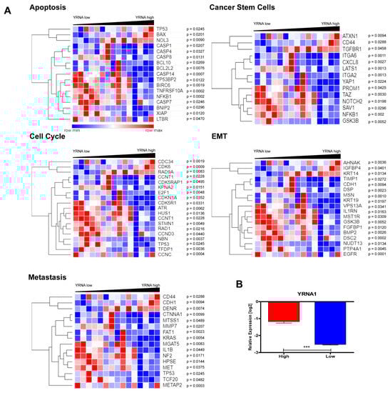 The expression of correlated genes with YRNA1 connected with different processes. (A) The expression of correlated genes with YRNA1 connected with tumour metastasis, cancer stem cell development, apoptosis, epithelial to mesenchymal transition (EMT), and the cell cycle in the group of HNSCC TCGA patients with high and low expression of YRNA1; T-test; Mann–Whitney test; p < 0.05 considered as significant. (B) A comparative analysis of patients with high YRNA1 expression and low by T-test; p < 0.05 considered as significant.
