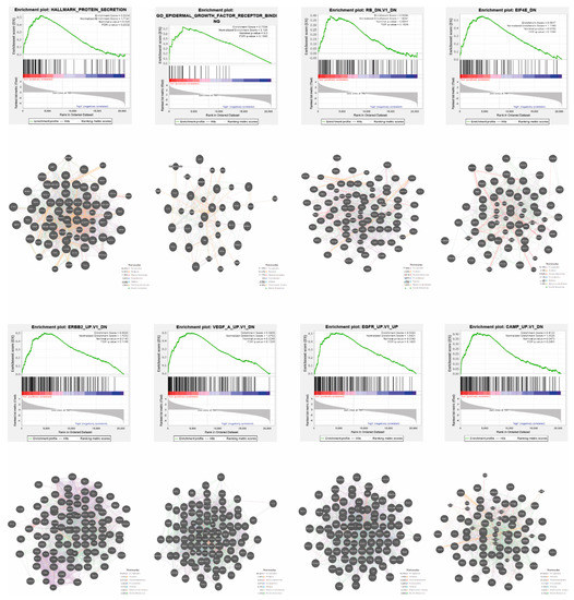 Functional implications of YRNA1 expression signature were analysed using gene set enrichment analysis (GSEA) and the eight top enriched datasets are shown in Figure 8. It was found that most upregulated genes in the YRNA1 low expressing group of patients are clustered most significantly in protein secretion, epidermal growth factor receptor binding, RB (the RB-dependent pathway), EIF4E (the EIF4E-dependent pathway), ERBB2 (the ERBB2-dependent pathway), VEGF (the VEGF-dependent pathway), EGFR (the EGFR-dependent pathway), and cAMP (the cAMP-dependent pathway) (normalized enrichment score (NES) = 1.7141, NES = 2.125, NES = 1.8207, NES = 1.7160, NES = 1.7050, NES = 1.6783, NES = 1.6421, and NES = 1.5026, respectively). Next, the interactions between protein coding genes in the pathways that were the most significantly enriched in the group of patients with low expression of YRNA1 were analysed using the GeneMANIA prediction tool. The following numbers of genes were indicated: protein secretion—53 genes, epidermal growth factor receptor binding—18 genes, RB-dependent pathway—71 genes, EIF4E-dependent pathway—51 genes, ERBB2-dependent pathway—83 genes, VEGF-dependent pathway—85 genes, EGFR-dependent pathway—81 genes, and cAMP-dependent pathway—64 genes, in which 64.23%, 21.19%, 77.56%, 70.16%, 78.87%, 88.42%, 78.70%, and 57.52% of them are co-expressed, respectively, Figure 8.