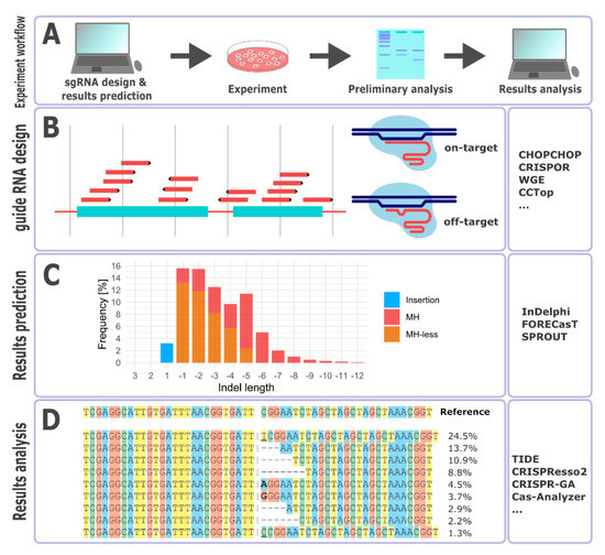 (A). The overview of a CRISPR-Cas experiment. Preliminary analysis involves screening of gRNA activity. Results analysis refers to NGS data analysis. (B). The gRNA design step involves the prediction of the gRNA efficiency (on-target activity) at a given locus and specificity (off-target activity); (C).The most probable results of CRISPR-Cas edits can be predicted by the analysis of microhomologies and by exploiting the known biases in the distribution of repair outcomes. (D). Web-based tools facilitating the post-experimental sequencing data analysis. MH—microhomology.