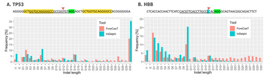 In the case of TP53, both algorithms correctly predicted the occurrence of a relatively long, 30 bp deletion as the most probable editing result. Indeed, we observed a biallelic deletion, 30 and 50 bp long at this site in HEK293T cells [47]. The 50 bp deletion was not predicted since it exceeds the indel length capacity of both tools. The results confirm that MMEJ-based repair may be harnessed for highly predictable and precise genome editing. In the case of HBB, neither FOREcasT nor InDelphi was able to accurately assess the probability distribution across the range of indels. As reported by Cradick et al. introduction of a DSB resulted in an exceptionally high frequency of a one nucleotide insertion at the locus (43.2%) in HEK293T cells, whereas the tools assigned its relatively low probability (3.9% vs. 6.7%, ForeCasT and InDelphi, respectively) [83]. Nonetheless, both tools were able to predict which nucleotide is the most probable to be inserted (cytidine). The principles determining the preference of a nucleotide to be inserted appear to be relatively straightforward—the inserted base is usually homologous to the nucleotide at position −4 from PAM (Figure 2B, marked in blue) [3,4]. The high frequency of single nucleotide deletions predicted by both algorithms stems from the occurrence of CCCC motif directly at the cutting site. It has been reported that cytosine at the −5 and −4 positions relative to the cutting site results in a high probability of a single nucleotide excision [3,4]. However, the real frequency of this event turned out to be significantly lower (6.8%) [83].
