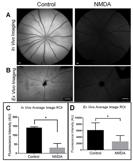 Axonal transport is impeded in a neurotoxic rat eye model. (A) An in vivo fluorescent image of the fundus of the eye, (B) and an ex vivo retinal flat mount illustrates control versus NMDA-treated eyes 3 h after an intravitreal injection of TTc-488 (8 µg in 2 µL PBS). Note the RA’s (radial linear pattern) centered on the optic nerve head in control eyes but markedly diminished in NMDA-treated eyes. The RGCs (foci pattern) are visible in the ex vivo image of control eyes only. Early retinal damage manifests as failed TTc-488 uptake and transport in retinopathic eyes. Note the close correspondence between in vivo (n = 3) and ex vivo (n = 5) quantitative findings in the (C) average fluorescence intensity for the in vivo control (141.67 AU ± 4.65) vs. NMDA-treated eyes (31.28 ± 23.18) (Mean ± SD) (p = 0.02, t = 7.192) and (D) ex vivo control (6185.09 AU ± 2262.34) vs. NMDA (2626.68 AU ± 1860.79) (Mean ± SD) (p = 0.03, t = 3.700) images compared with paired 2-tailed t-tests confirming a significant difference in TTc-488 uptake and transport between control and NMDA-treated eyes. Scale bars for in vivo 200 µm, and ex vivo imaging, 500 µm. * significant different, p ≤ 0.05.