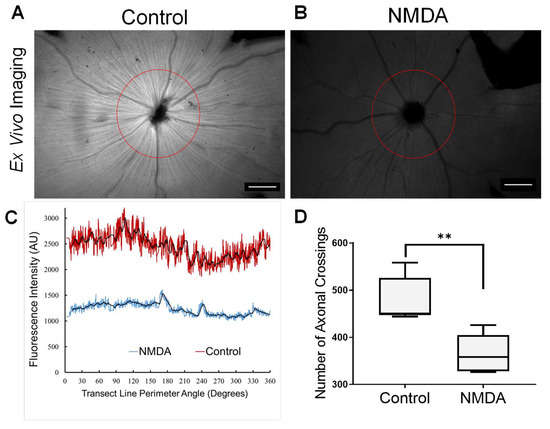 Retinal transect analysis demonstrating the impact of NMDA on axonal transport. Circular transects are drawn around the optic nerve head with a 500 µm radius (presented in circular degrees) in control (A) and NMDA-treated (B) eyes. The fluorescent intensity plotted along the transect (C) allows an estimate of the number of axonal strand crossings, defined as the number of times the fluorescence intensity graph crosses through a baseline moving average fit (period of 25) with vascular structures edited out. Note the greater overall magnitude of normal versus neuropathic retinas (relative average height of transects) with about 2500 AU for control and 1200 AU for NMDA-treated eyes, indicating relatively less overall uptake in NMDA eyes. The number of crossings is plotted and compared (D) for n = 5 animals and is significantly less for the NMDA-treated versus normal eyes (365 ± 41.46 versus 479 ± 48.41 crossings) (Mean ± SD) (2-tailed paired T-test, p = 0.003, t = 6.41), indicating the relative loss of the radial linear pattern representing RAs. All exposure levels kept constant for quantitation purposes. Scale bar 500 µm. ** highly significant difference, p ≤ 0.005.