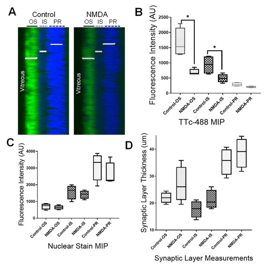 NMDA neurotoxicity affects TTc-488 uptake and transport to individual synaptic layers of the retina. (A) Maximum intensity projection (MIP) of a full thickness retina confocal image was obtained in a z-stack projection of 130 µm. TTc-488 fluorescence intensity was measured volumetrically for the OS layer (including the retinal ganglion cell layer), for the IS (including the bipolar nuclei) as well as the PR of the retina. (B) A two-tailed paired t-test between fluorescence intensity averages of control vs. NMDA-treated eyes showed a significant reduction of TTc-488 in the OS layer (1655.75AU ± 470 vs. 686.75AU ± 109, (Mean ± SD), p = 0.0352, t=3.660, df=3), and in the IS layer (932.38 ± 314 vs. 490.38 ± 138, (Mean ± SD), p = 0.0387, t = 3.528, df = 3), but no significant difference in the PR layer (p = 0.0630, t = 2.890, df = 3). (C) There was no significant difference for any of the retinal layers (OS p = 0.3487, t = 1.108; IS p = 0.2433, t = 1.448; PR p = 0.3786, t = 1.030 with df = 3 for all layers) in the nuclear-stained TO-PRO-3-Iodide (blue) fluorescence intensity, corresponding to nuclear counts, suggesting that cell number decreases were not responsible for the observed differences in TTc uptake. (D) The thicknesses of individual retinal synaptic layers were not significantly different between control and treated eyes at this time point in any of the synaptic layers (OS p = 0.2574, t = 1.395; IS p = 0.2276, t = 1.521; PS p = 0.5213, t = 0.7243 with df = 3 for all layers). Measurements were made on n = 5 animals with two imaging points per eye for all synaptic layer measurements. Scale bar 50 µm. * significant different, p ≤ 0.05.