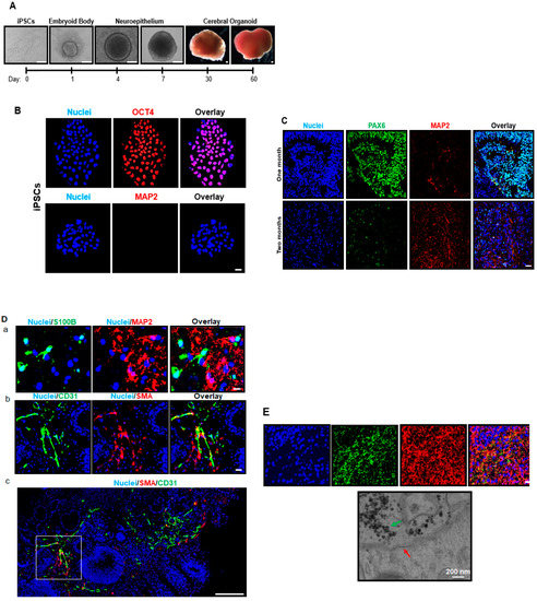 Human-induced pluripotent stem cells (iPSCs) retain pluripotency, but do not show markers of neural differentiation. iPSCs differentiate into cerebral organoids over time. (A) The schematic depicts the process of cerebral organoid generation from iPSCs. By use of chemically defined medium and plating strategies, iPSCs are differentiated into cerebral organoids. Singularized iPSCs aggregate into embryoid bodies in ultra-low attachment plates, begin to differentiate into neuroepithelial tissue, and result in formation of cerebral organoids following matrigel embedding. Scale bar = 200 μm. (B) Immunofluorescent staining marks the presence of octamer-binding transcription factor 4 (OCT4 (red)) as an indicator of pluripotency, but the microtubule-associated protein 2 (MAP2) (a neuron-specific marker) is not detected in iPSC colonies. Nuclei are stained in blue. Scale bar = 20 µm. (C) Immunofluorescent staining marks the expression of the paired box protein 6 (PAX6) in neural epithelial progenitor cells (green) in 1-month-old cerebral organoids, which is markedly reduced in 2-month-old cerebral organoids. MAP2-positive neurons are expressed in 1-month-old cerebral organoids, but more staining appears at 2 months. Nuclei are shown in blue. Scale bar = 10 µm. (D) Cerebral organoids exhibit protein markers of various brain cells, such as neurons, astrocytes, and vascular cells (endothelial cells and smooth muscle cells). Immunostaining shows S100 calcium binding protein B (S100B; an astrocyte marker) and MAP2 (a neuron marker)-positive cells (green and red, respectively) in 2-month-old organoids (a). Cerebral organoids stain positive for blood vessel-related endothelial and smooth muscle cell markers, CD31 (green) and smooth muscle actin (SMA) (red) (b), respectively. Nuclei are stained in blue. Image b shows a magnified view of the boxed area in image (c). Scale bar = 50 μm for image b and 200 μm for image (c). (E) Formation of organized synapse structure in cerebral organoids. In 2-month-old organoids, immunofluorescent staining for pre-synapse marker synapsin I (green; distributed in a punctuated pattern) shows a vast number of synapses between MAP2-positive cells. Nuclei are stained in blue. Scale bar = 50 μm. An individual synapse is shown by an image from electron microscopy. The green and red arrows point to pre-synaptic vesicles and post-synaptic density, respectively. Scale bar = 200 nm.