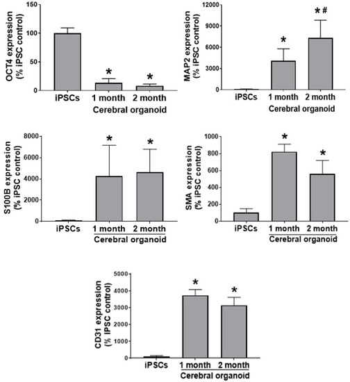 Reduction of the pluripotency marker gene expression and increases in the gene expression of neuron, astrocyte, endothelial cell, and smooth muscle cell markers over time as iPSCs differentiate into cerebral organoids. Quantitative real time polymerase chain reaction (qRT-PCR) reveals decreased OCT4 gene expression over the 2-month differentiation, while MAP2 increases over time. qRT-PCR shows an increase in S100B, SMA and CD31 gene expression over the two-month differentiation process from iPSCs to cerebral organoids. n = 4, data are expressed as mean ± standard error of the mean (SEM), and p < 0.05 was considered statistically significant. * Denotes a significant difference from iPSCs, and # denotes a significant difference in the 2-month relative to the 1-month stage.