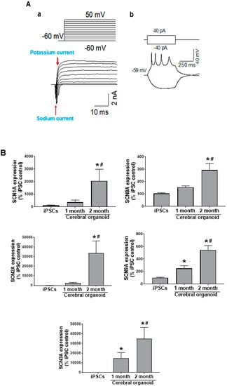 Cerebral organoids possess action potentials. (A) Over a range of depolarizing voltages, whole cell recordings from 2-month-old cerebral organoids show evidence of potassium and sodium current (a) and action potentials (b). (B) The genes encoding Nav1-3 and Nav6-7 voltage-gated sodium channels are SCN1-3A and SCN8-9A, respectively. qRT-PCR detected all genes to be upregulated throughout the differentiation process (n = 4). Data are expressed as mean ± SEM, and p < 0.05 was considered statistically significant. * denotes a significant difference from iPSCs, and # denotes a significant difference in the 2-month relative to the 1-month stage.