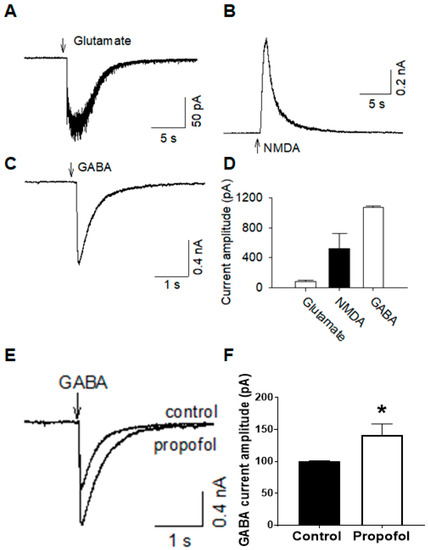 For recordings of glutamate currents, cells were voltage-clamped at −70 mV; the internal solution contained K+-based solution as described above. For recordings of N-methyl-d-aspartate (NMDA) currents, the internal solution contained Cs+-based solution (in mM): 100 Cs-methanesulfonate, 10 CsCl, 10 HEPES, 1.1 EGTA, 2 MgCl2, 2.5 Mg-ATP, 0.3 Na2GTP and 10 Na2-phosphocreatine (pH 7.3 with CsOH) were used. Cells were voltage-clamped at +40 mV, and glycine (1 µM) was present in the ACSF. Patch pipettes were filled with ACSF containing glutamate (0.5 mM) or N-methyl-d-aspartate (NMDA; 0.5 mM) and were positioned near recorded cells (20 µm). Glutamate or NMDA was applied by a brief pressure (5 psi, 1 s). For recordings of gamma aminobutyric acid (GABA) or propofol currents, the internal solution contained (in mM): 100 K-gluconate, 50 KCl, 10 HEPES, 1 EGTA, 0.1 MgCl2, 4 Mg-ATP, 0.3 Na2GTP and 10 Na2-phosphocreatine (pH 7.3 with KOH) were used. Gamma-aminobutyric acid (GABA; 0.5 mM) or propofol (10 µM) was applied by a pressure ejection similar to the glutamate or NMDA pressure injection. For studies of the effects of propofol (10 μM) on the amplitude and the decay time of GABA currents, GABA currents were evoked and recorded before and after the bath and the application of propofol.